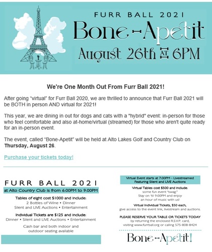 We are back! Please join us for the 2026 Furr Ball at Alto Lakes Golf & Country Club! We will have dinner, entertainment and live and silent auctions. We're about caring for animals and finding their forever homes!