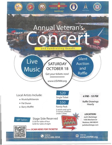 The "US Veterans of New Mexico", a 501c3 organization located in Ruidoso, NM who purpose is to aid voluntarily and render assistance to all Armed Services Veterans and their families in New Mexico, will be holding a Silent Auction and Fundraiser.